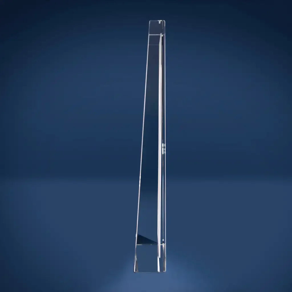 Avec ses dimensions impressionnantes de 300 x 200 mm, ce prisme en verre personnalisé attire tous les regards. Sa coupe géométrique inclinée vers le sommet crée un effet sculptural moderne et dynamique.